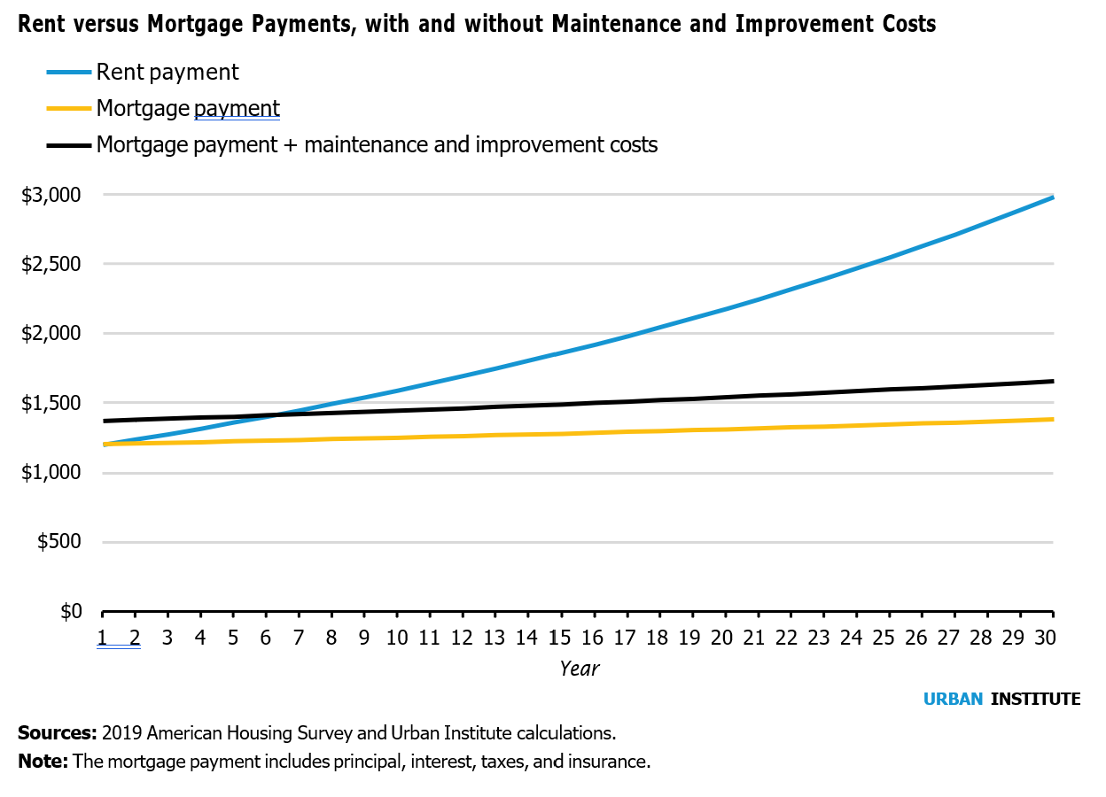 For households with lower incomes, homeownership is typically more affordable than renting, especially when controlling for income. The stability of fixed-rate mortgages also helps, as homeowners enjoy predictable payments, unlike renters who face annual rent increases.