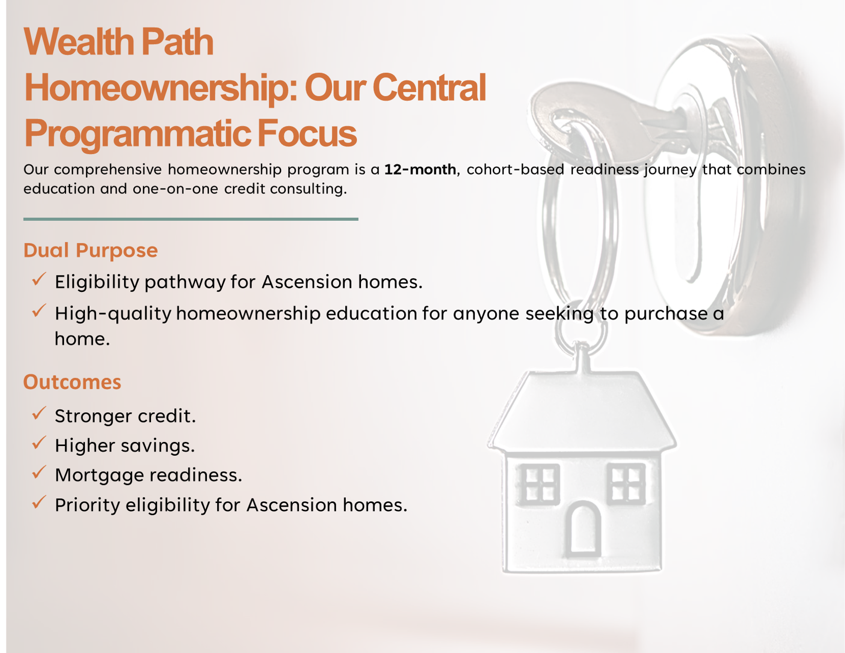 WealthPath is Ascension’s flagship 12-month, cohort-based homeownership readiness program serving Charlotte’s missing middle and essential workers. It combines financial education, one-on-one credit counseling, and mortgage preparation to create priority eligibility for Ascension homes. Through strong community partnerships, WealthPath expands access, strengthens credit, builds savings, and drives long-term economic mobility.